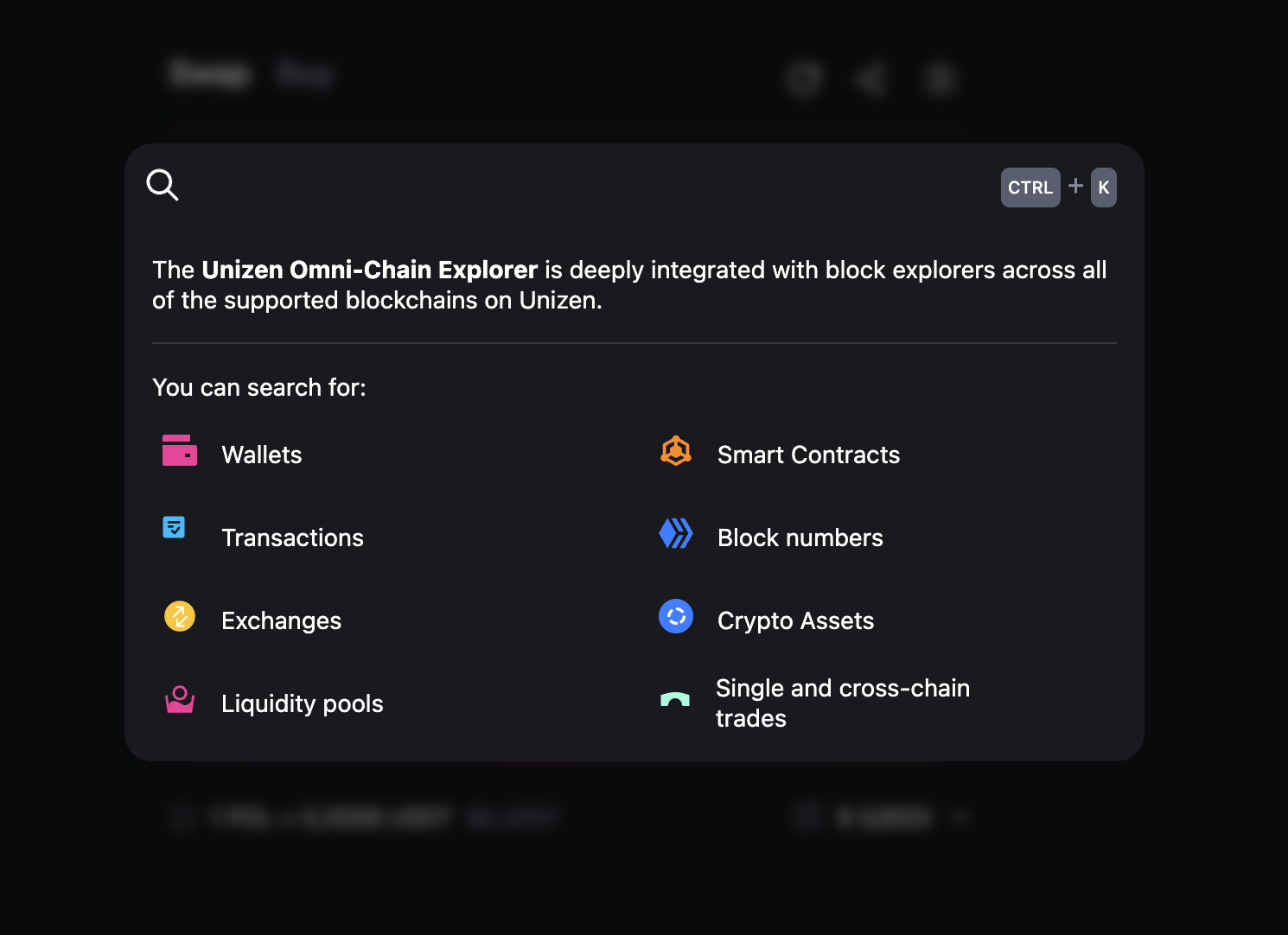 <figure><img src="https://1510373414-files.gitbook.io/~/files/v0/b/gitbook-x-prod.appspot.com/o/spaces%2F7JXcB8KHgOrQ0aFkHXeg%2Fuploads%2FtehZNWFtoajkpKgzFWR3%2Fimage.png?alt=media&#x26;token=4ad581df-415d-4ace-bb64-bd43505d01c1" alt=""><figcaption><p>Unizen explorer search</p></figcaption></figure>